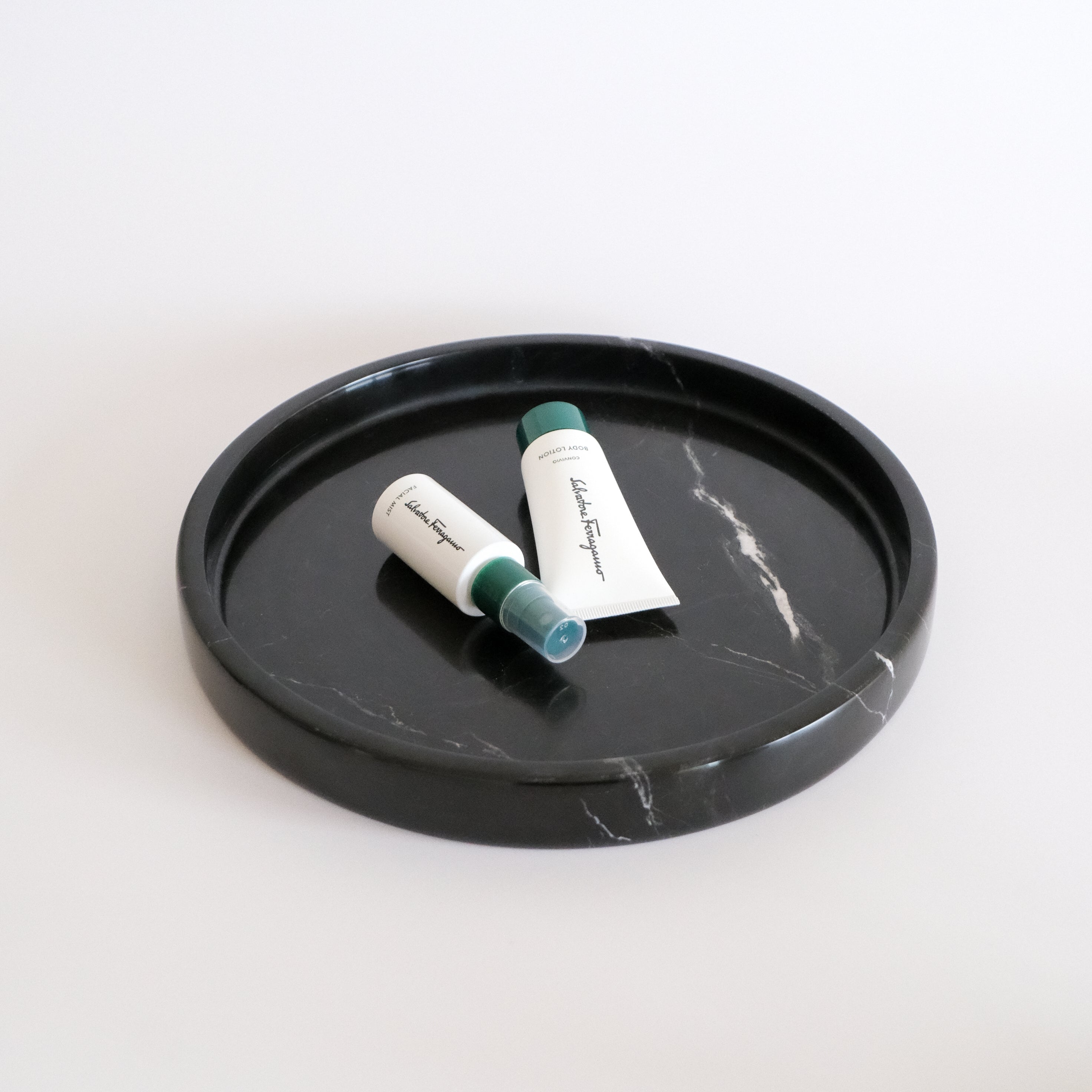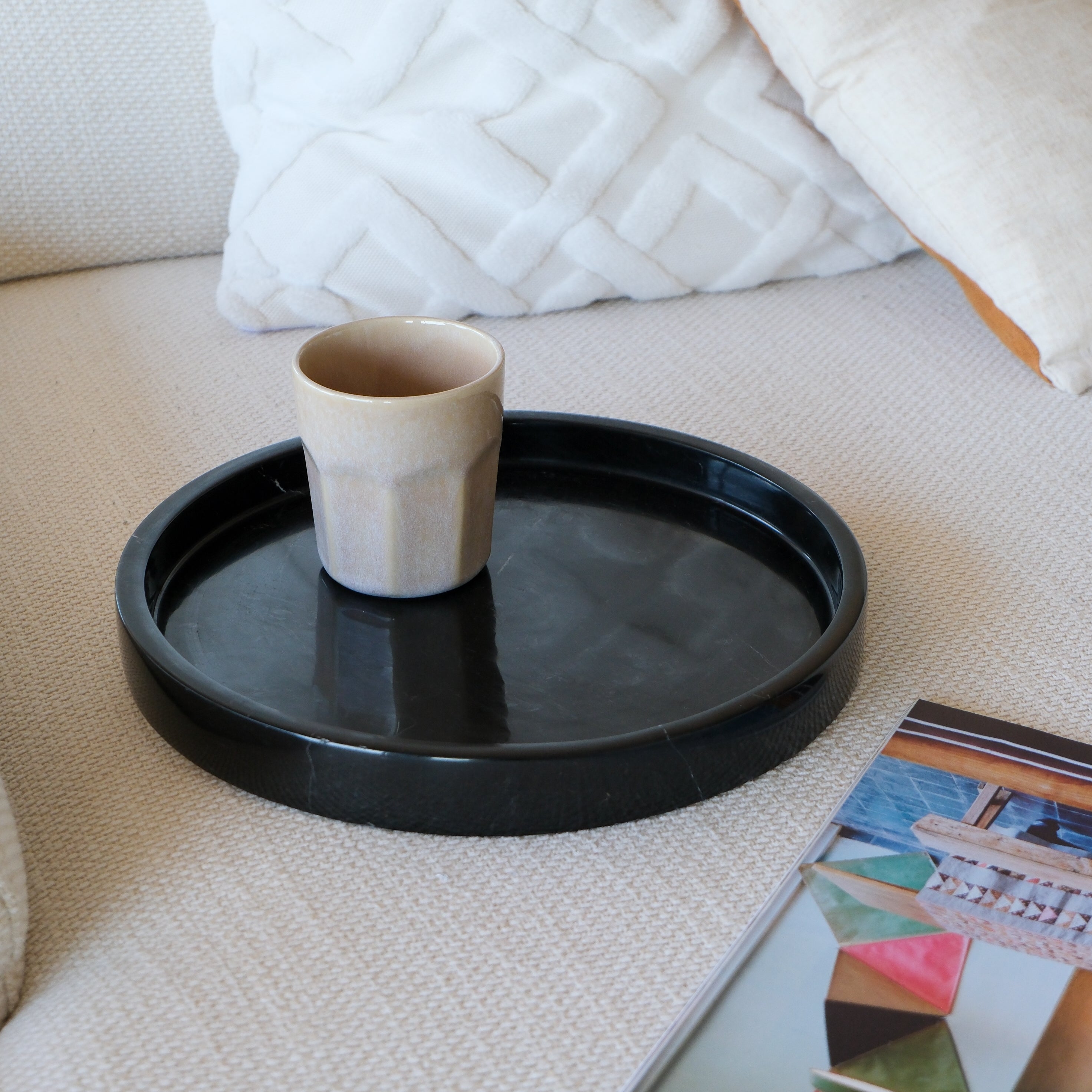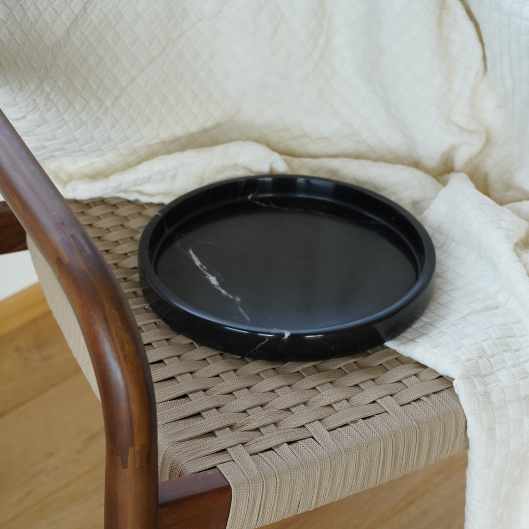 Introducing the Raya Marble Tray Black - a captivating round tray crafted from rich, dark marble. Its deep, luxurious color exudes a sense of opulence and refinement. This tray is the perfect choice for making a bold statement in your home decor. Its sleek, polished surface beautifully highlights your favorite decorative items, creating a striking focal point that is sure to impress.